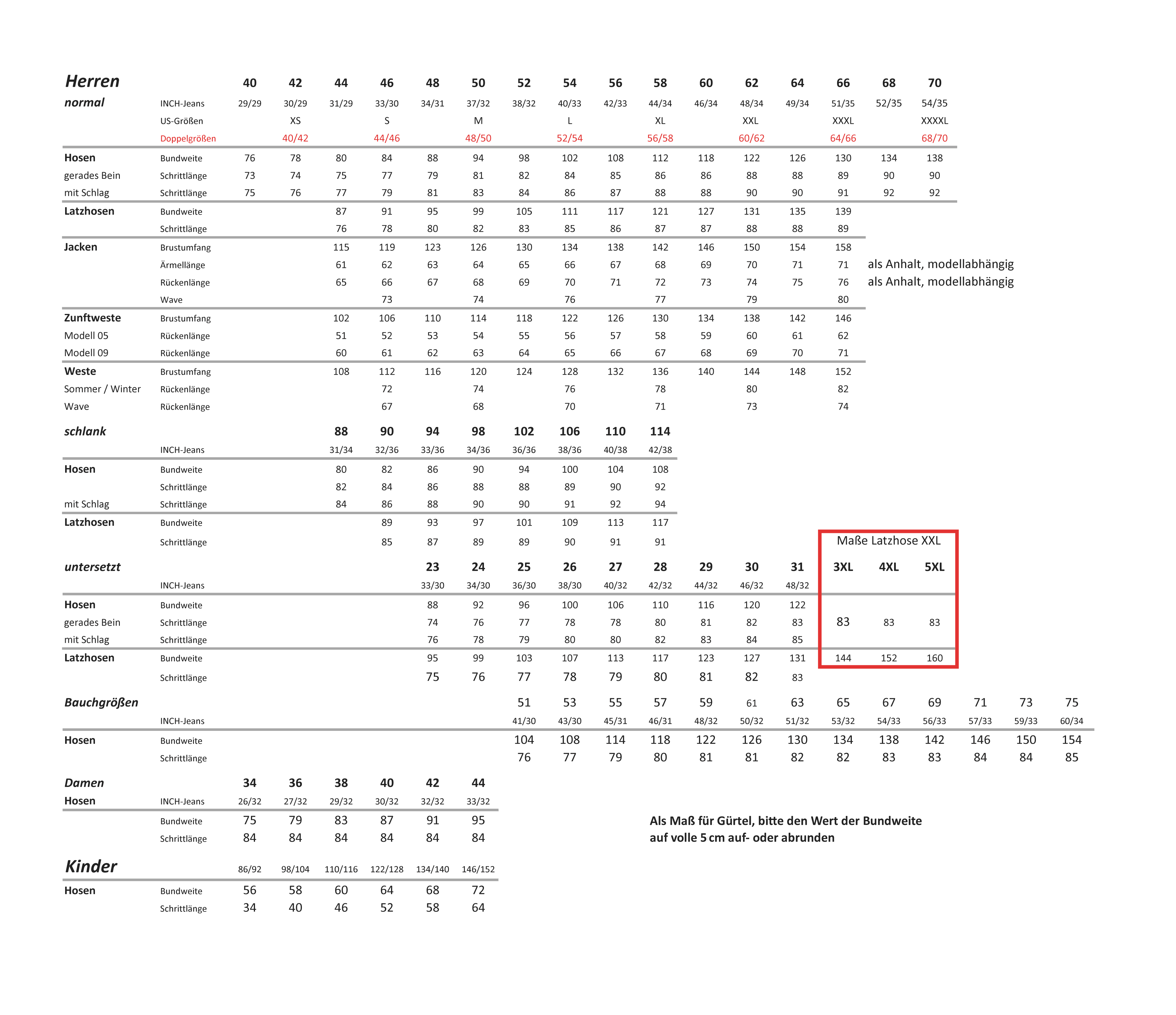 Grössentabellen